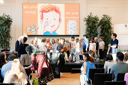 Unsere Begrüßung fand in der Aula statt. Gemeinsam starteten wir mit der Geschichte „Mutmurmeln für den ersten Schultag“, die uns Mut und Vertrauen für unsere neuen Abenteuer als Schulkinder schenkte. Passend zur Geschichte wurden dann auch gemeinsam die ersten Mutproben gemeistert. Rückwärts fortbewegen, Balanceübungen oder auch mit geschlossenen Augen gehen, waren unter anderem unsere ersten gemeinsamen Aufgaben, die von allen wunderbar bewältigt wurden.