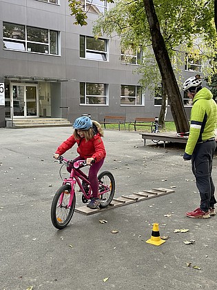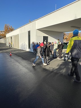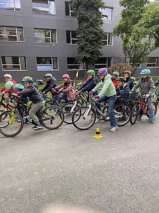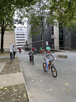 Im Innenhof fand für die 3b ein spannendes Fahrradtraining mit zwei Trainer*innen statt. Jedes Kind brachte sein eigenes Fahrrad mit, und auf einer mit bunter Kreide gezeichneten Strecke konnten wir viele verschiedene Übungen ausprobieren.