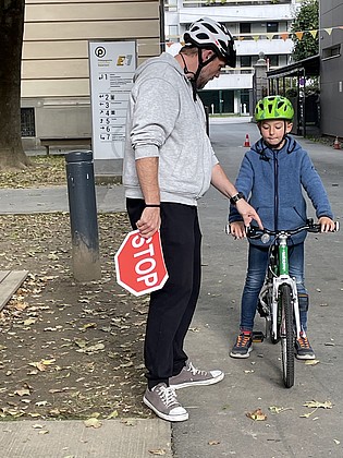 Beim Stoppschild mussten wir aufmerksam sein und sofort bremsen, wenn es hochgehalten wurde. Außerdem fuhren wir über eine holprige Platte, um das Gleichgewicht zu trainieren, und übten, wie man beim Fahren richtig die Gänge wechselt.