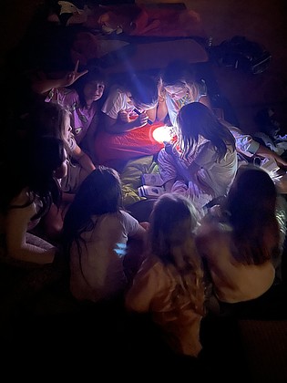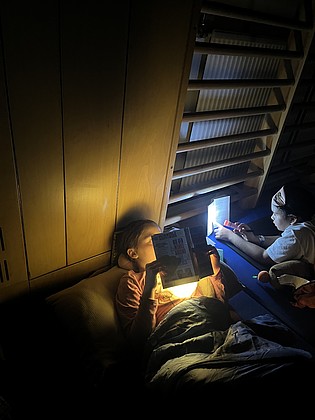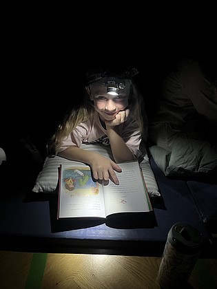 Als es endlich hieß: „Licht aus, Taschenlampen an!“, wurde es richtig gemütlich. Überall flackerten Leselichter, Bücher wurden aufgeschlagen, Geschichten entfalteten sich – und der Turnsaal verwandelte sich in eine flüsterleise Fantasiewelt.