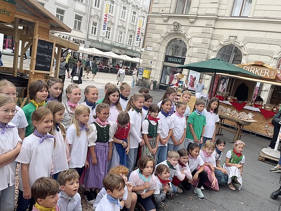 Die 2b und wir, die 4a, probten fleißig im Turnsaal und in der Aula für das Aufsteirern. Frau Eichler von der Tanzschule Eichler kam mehrmals zu uns und studierte mit uns eine Choreografie ein. Diese haben wir am Sonntag, dem 14. September 2025, am Grazer Hauptplatz aufgeführt.