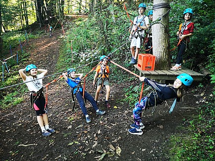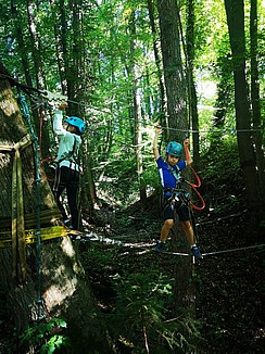Am Donnerstag stand uns ein tolles Sportprogramm bevor. Am Vormittag gingen wir in den Wald, wo wir bei Susanne ein Piratenspiel spielten und auf weichen Polstern landeten. Bei Markus konnten wir ganz nach oben auf Bäume klettern. Hier hatten wir sogar einen Schutzanzug an. Das hat uns sehr viel Spaß gemacht und war wirklich toll. (Geschrieben von Felipe, Ugur, Stefan)