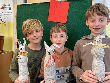 Im Rahmen eines weiteren gemeinsamen kreativen Upcycling-Projekts der Kindern der 4.b Klasse und zwei Studierenden der Pädagogischen Hochschule bastelten wir entzückende Osterhasen. Im Mittelpunkt stand die Technik des Pappmaché, bei der wir aus Zeitungspapier, Kleister und alten Geschenksbändern formbare Hasenfiguren gestalteten. Der Korpus bestand, wie schon damals bei unseren Dschungeltieren, aus alten Kunststoffverpackungen. Die Materialien wurden geschichtet, geformt und anschließend dekoriert, wodurch individuelle und nachhaltige Kunstwerke entstanden.