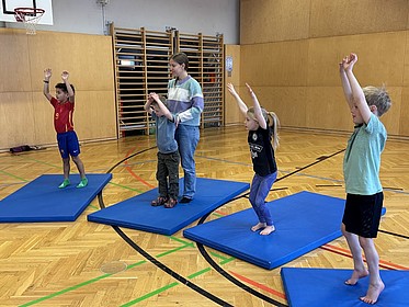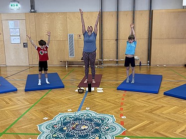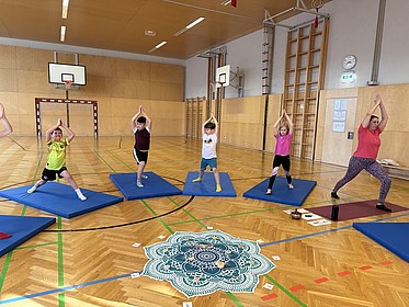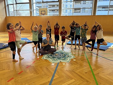 Nach einem kurzen Aufwärmspiel versammelten wir uns im Kreis und begrüßten uns achtsam mit dem traditionellen Yogagruß „Namaste“. Gemeinsam starteten wir danach mit dem Sonnengruß. Im Hauptteil der Einheit lernten wir verschiedene kindgerechte Yogaübungen kennen, darunter der Berg, das Einhorn, der Baum und der Flamingo. Mit viel Freude und Konzentration probierten wir die einzelnen Positionen aus.