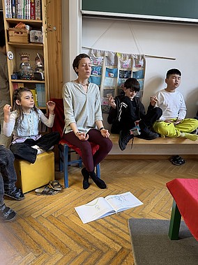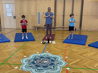 Frau Rothländer, Mama von Tobias (MSKa) und Jonas (MSKb) und ausgebildete Kinderyogalehrerin, besuchte uns und gestaltete zwei abwechslungsreiche Yogaeinheiten.