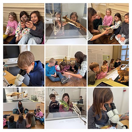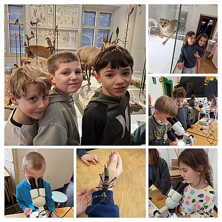 Im Rahmen unseres Sachunterrichts besuchten wir im Naturkundemuseum die Ausstellung „Insekten – von Ameisenlöwen und Nashornkäfern“ - es war ein echtes Erlebnis! Gemeinsam mit Sophie und Marta tauchten wir in die faszinierende Welt der Insekten ein. Während eines interaktiven Rundgangs durch den biowissenschaftlichen Teil der Dauerausstellung erfuhren wir, warum Insekten die erfolgreichste Organismengruppe der Erde sind, weshalb sie so unterschiedlich gefärbt sind, warum sie eine Verwandlung durchlaufen und welche bedeutenden Rollen sie in unseren Ökosystemen übernehmen. Besonders spannend waren die anschaulichen Materialien, die das Lernen lebendig und greifbar machten. Die Kinder hörten interessiert zu, stellten viele Fragen und konnten ihr Wissen vertiefen.